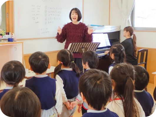 子どもたちが楽しみながら自然と学べる環境づくりを大切にし、気持ちに寄り添いながら、成長に合わせて組み立てるレッスン。講師の経験から生み出された様々なメソッドを実践中。