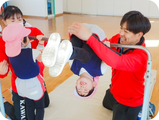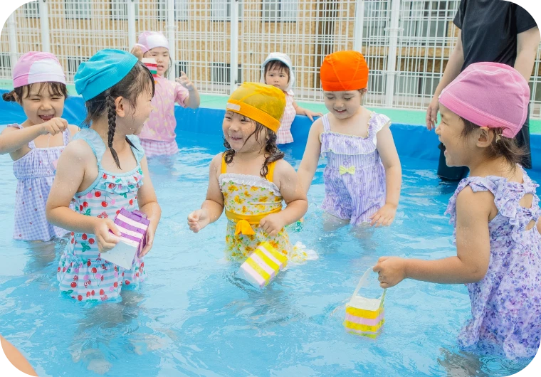 カワイ体育教室の先生に来ていただいて、体操を通して身体を動かす心地よさや集中力を養っています。夏はプールの指導もあります。