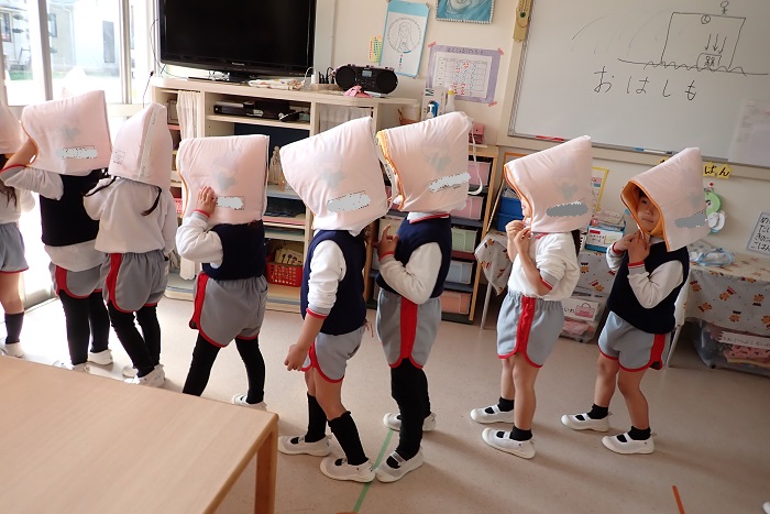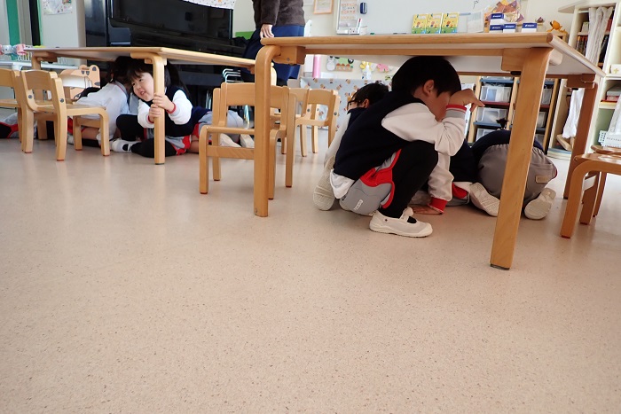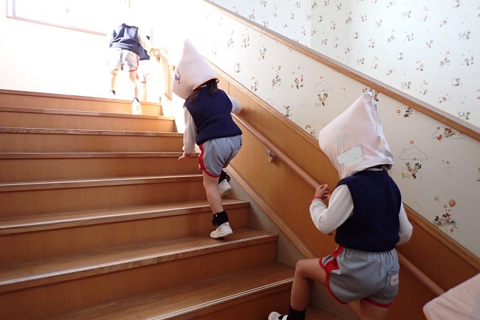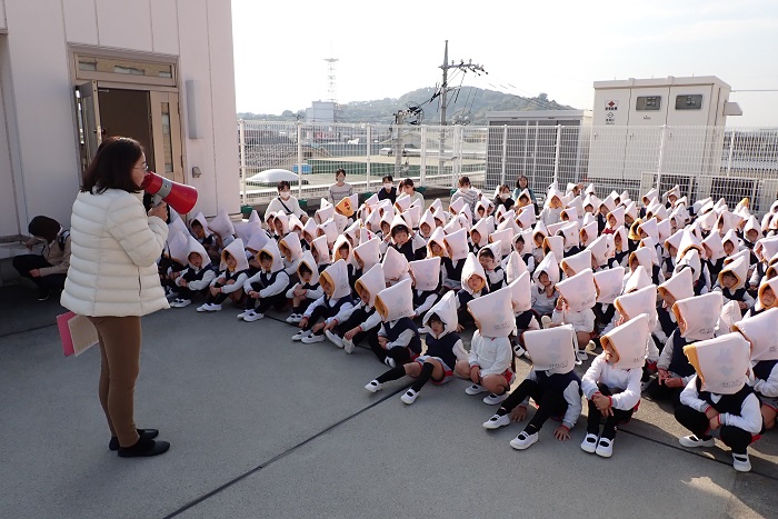 地震発生後、津波警報が発令されたことを想定した避難訓練を行いました。非常ベルの音を怖がる子どももいましたが、先生の指示に従ってすみやかに屋上に避難することができました。